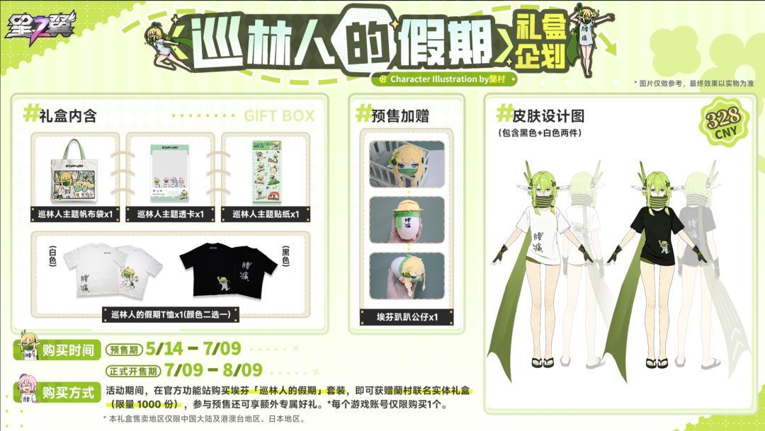 活动期间,在官方功能站购买埃芬「巡林人的假期」套装(内含黑色+白色两件),即可获赠蘭村联名实体礼盒:含巡林人主题帆布袋*1、透卡*1、主题贴纸*1、T恤*1,限量1000份!参与预售还可享额外专属好礼:埃芬趴趴公仔*1。