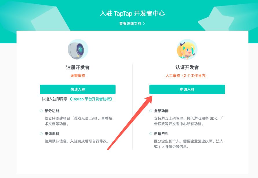 首先需要在 TapTap Developer Center 将自己的 TapTap 账号认证开发者,填写规范的信息后将会很快过审,如拒审,注意查看站内消息,根据提示修改即可。