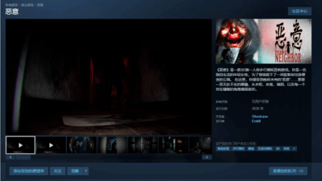 近期,由中国独立游戏团队 ghostcase 工作室(代表作《凶寓》)开发、Erabit 发行的 3D 第一人称心理恐怖游戏《恶意 / Dread Neighbor》正式官宣定档,将于5 月 7 日登陆 Steam 平台,售价26 元人民币,发售后两周内享九折优惠(折后 23.4 元)。这款以现代中式恐怖为核心的作品取材自真实事件,聚焦城市独居青年的 "窥视恐惧",通过渐进式循环叙事和多视角切换,将日常生活中的隐秘不安转化为沉浸式心理惊悚体验。