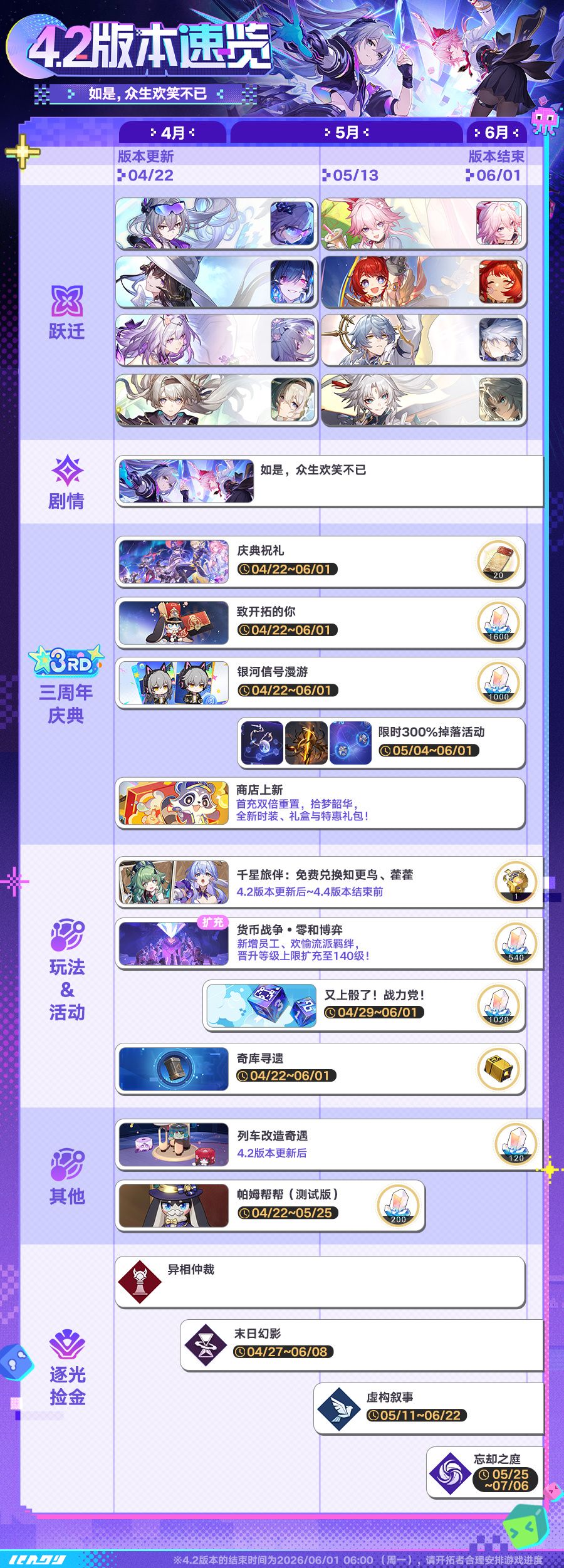 4.2版本「如是,众生欢笑不已」即将于4月22日正式上线,三周年庆典、新角色、新剧情、海量福利悉数登场,邀各位开拓者一同踏入欢愉世界,共赴三周年狂欢。