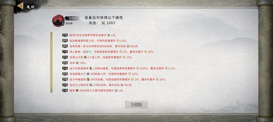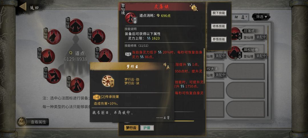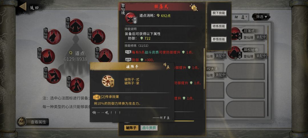 心法:不玩蓄力就只需要做羽化套的破阵子和云梦行,破阵子是10%防御转攻击,云梦行是直接增加10%伤害,相当友好。