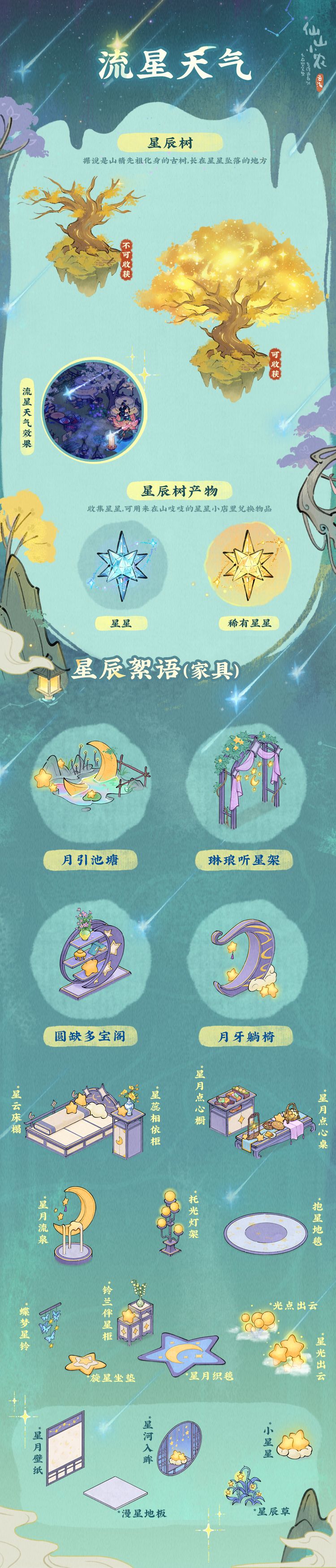 ⭐传说在灵盈峰西北处有一棵大树,名为星辰树,若在特定时间向流星许愿,星辰树上便会结出神奇的果实,小农可用这些果实前往山吱吱的星星小店里兑换许多珍贵的奖励。(该功能将于下周更新后正式开放,届时小农可前往灵盈峰探索~)