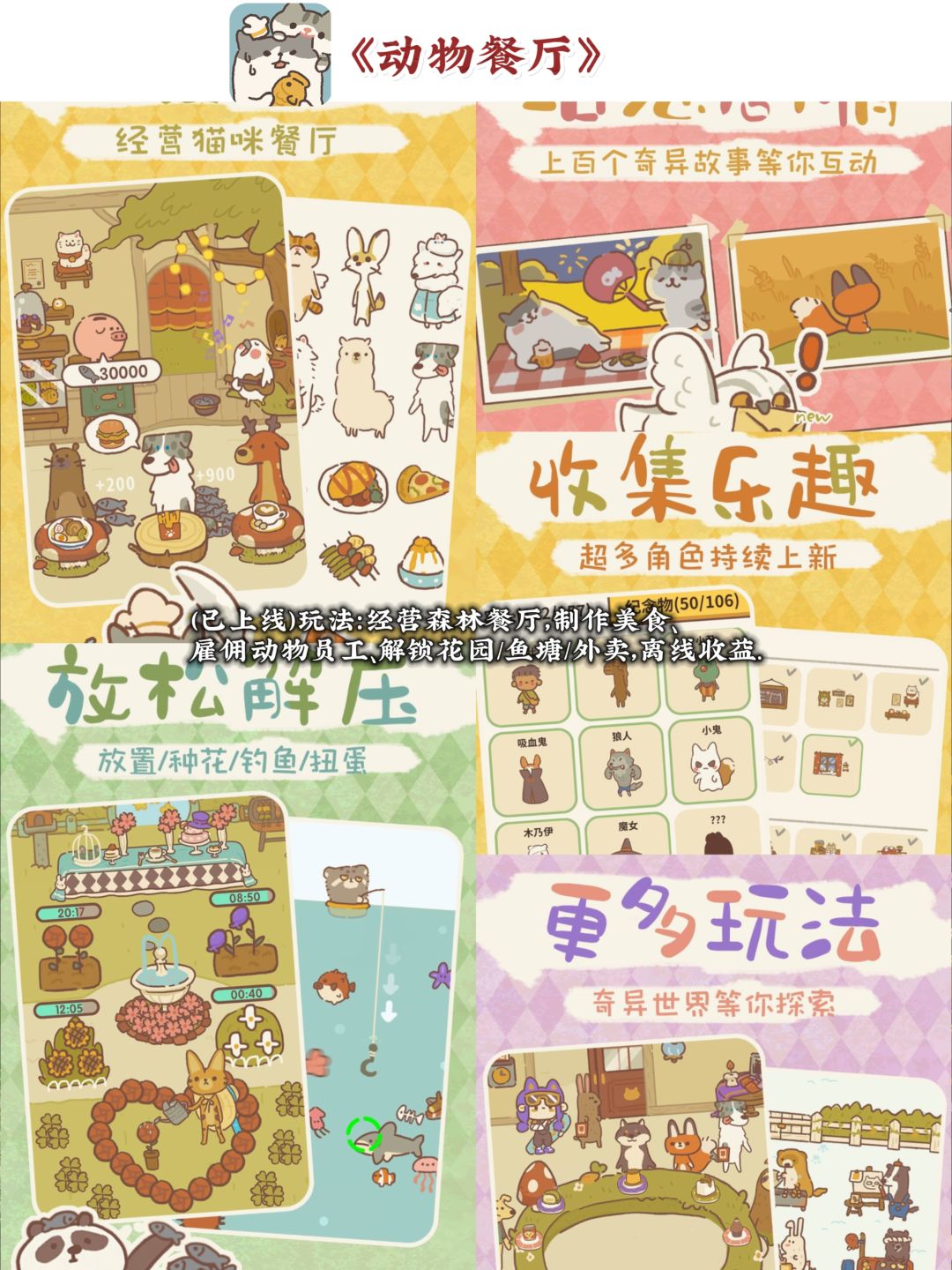 1.动物餐厅(已上线):治愈系放置经营,用暖心美食招待萌趣动物,解锁花园鱼塘,佛系解压超治愈。