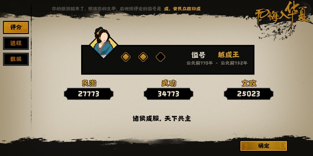 不过二十几万,但越国依旧疯狂的发动一次又一次的战争,越国的军队也不负重任百战百胜,最后在越国的计谋下,上郡百姓接杆而起,推翻了秦国的统治,燕国则在最后一场守城战的失败后灭国,义渠国国君也在荣华富贵的诱惑之下,选择了投降,最终华夏一统。