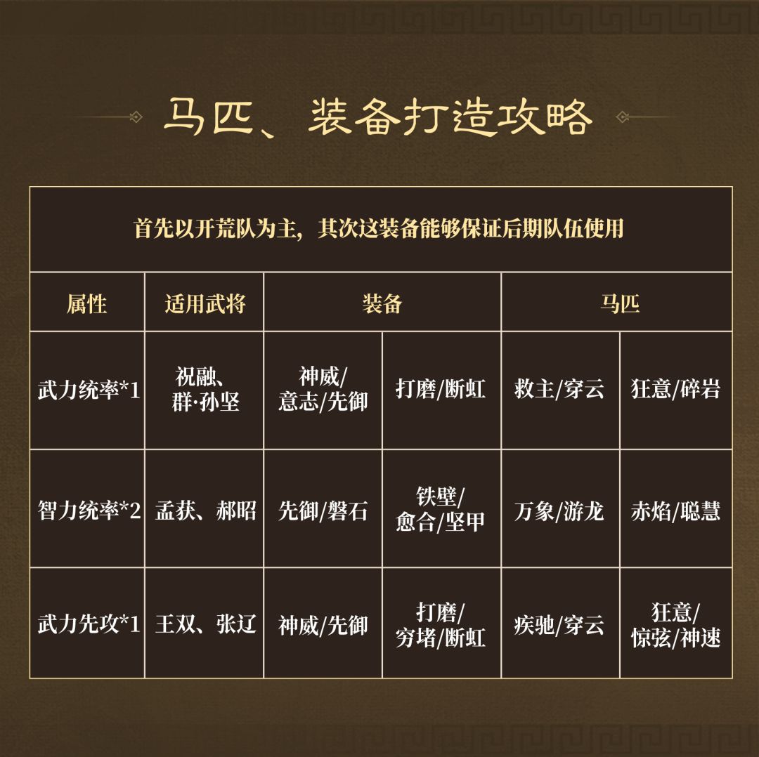新赛季装备打造:首先,开荒队以南蛮队为主,需要两套智+统、一套武+统;其次,这些装备最好能提供给后期新赛季武将郝昭使用,确保从开荒用到打架。第四件装备则以新赛季武将王双的武力+先攻/统率为主。
