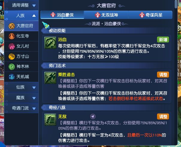 大唐官府新增奇谋兵圣流派,浴血豪侠四扫概率提升,无双战神剑意溅射效果增强;化生寺杏林妙手在雨天可推 7,仁心经脉附加护心状态;女儿村妙舞佳人流派重做,轻拍舞步可直接叠满天花雨;方寸山拘灵散修新增被动提升封印命中且可封鬼魂目标,伏魔天师控场与法伤提升;神木林灵木药宗流派治疗基础效果降低但治疗加成系数大幅提升;天机城三流派全调整,磐石宗匠封印与抗封提升,千机修罗先发技能下放,神机圣手重做匠魂等技能并强化群体治疗。