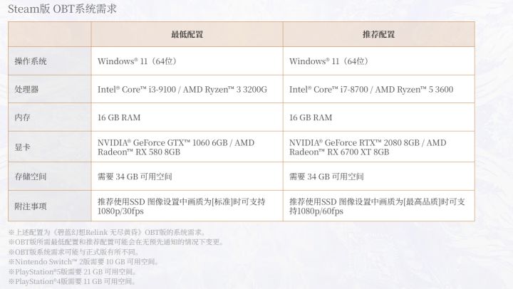 设备配置也公开了,如图三,PC版最低配置需i3-9100、GTX 1060 6GB及16GB内存,推荐i7-8700、RTX 2080;各主机平台存储空间在10GB至21GB不等。