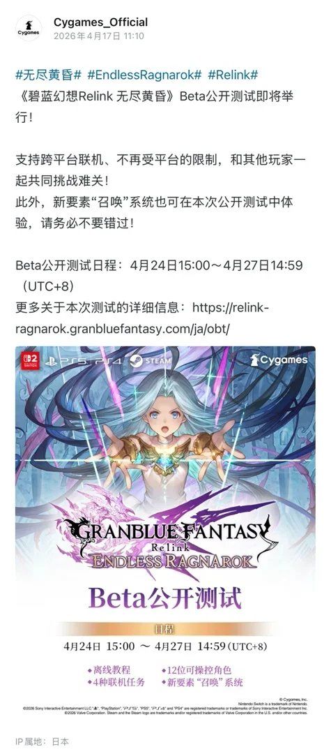 Cygames今日正式官宣,《碧蓝幻想Relink 无尽黄昏》将于4月24日15:00至4月27日14:59举行Beta公开测试,无需申请资格,所有玩家均可参与(如图二)。本次测试支持PS5、PS4、Switch 2及Steam平台之间的跨平台联机,预下载将于4月23日15:00开放。Switch 2版本还支持本地联机,但不支持游戏分享功能。