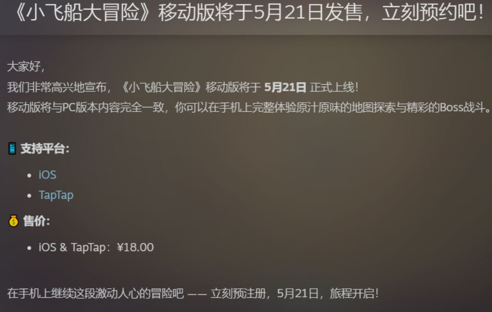 《小飞船大冒险》开发商正式官宣移动端版本,将于5月21日登陆iOS和安卓平台,定价18元,Steam版原价58元,这价格可以说非常良心了,引发玩家期待。官方预告移动版将与PC版内容完全一致,玩家可在手机上完整体验原汁原味的地图探索、流畅战斗与精彩 Boss 战,不受设备限制随时开启冒险。