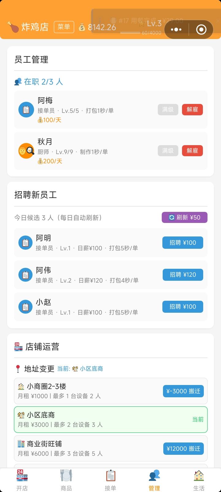 8.剧情线:雇佣了阿梅,第10天聊天列表解锁阿梅,第12天出现小雨,27天解锁小雨,开了猪脚饭后面会解锁婉儿。跟女友过生日必须开蛋糕店,跟女友表白必须开鲜花店。