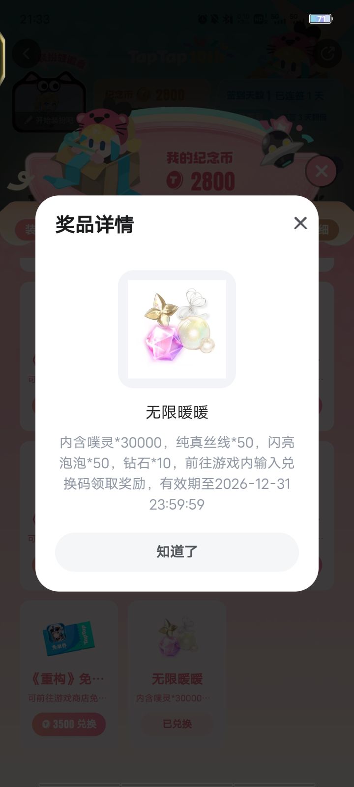 点击搜索→点击热搜第一的taptap十周年活动/直接搜十周年,第一个taptap十周年活动→点击福利兑换(最上面一栏的中间,纪念币下面)→切换到游戏福利,然后下滑找到无限暖暖,选择用250纪念币兑换奖励✧٩(ˊωˋ*)و✧
