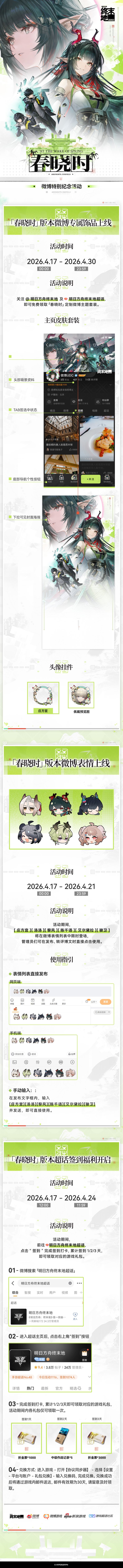 同步上线的还有微博平台专属【微博表情】活动,活动周期为2026年4月17日00:00至2026年4月21日23:59,玩家前往微博平台,即可领取「春晓时」主题定制表情,在社交互动中使用专属春日表情包,分享游戏体验与春日喜悦,让春日氛围延伸至游戏外的社交场景。