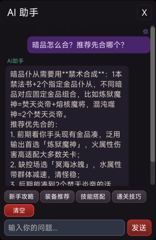 问攻略:"暗品怎么合?推荐先合哪个?" → AI 准确列出所有 11 个暗品的合成公式并给建议