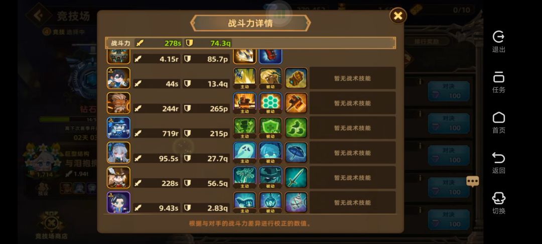 如图,竞技场,想捏个软柿子,结果被反杀,一看战力不对啊,研究了半天,换成和对方一样的阵容,对方战力基本正常了。下面这句“根据与对手的战斗力差异进行校正的数值”有点说法啊,不同的阵容导致对手战力相差百倍,真有你的。