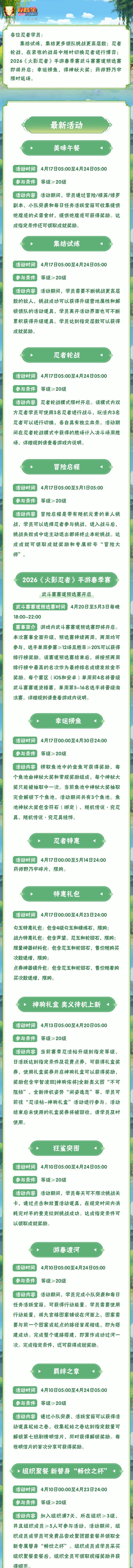 日常活动,美味午餐、集结试炼、忍者论战从17日5点开到24日5点,只要等级≥20级就能玩,攒食材、爬层挑战能拿成就奖励,忍者论战还能切换3个忍者打,胜场数还能算进决斗场。