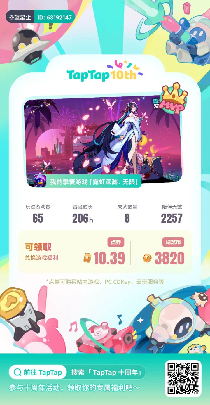 最初是在朋友推荐下慕名而来,亲身感受到taptap的社区氛围后待了下来。六年时间过去一晃眼大学都要毕业,可要找工作准备成为牛马了,希望成为社会人士后也能不忘初心一直保持对游戏的热爱吧,也祝愿taptap越来越好,期待玩家们有你陪伴的下一个十年