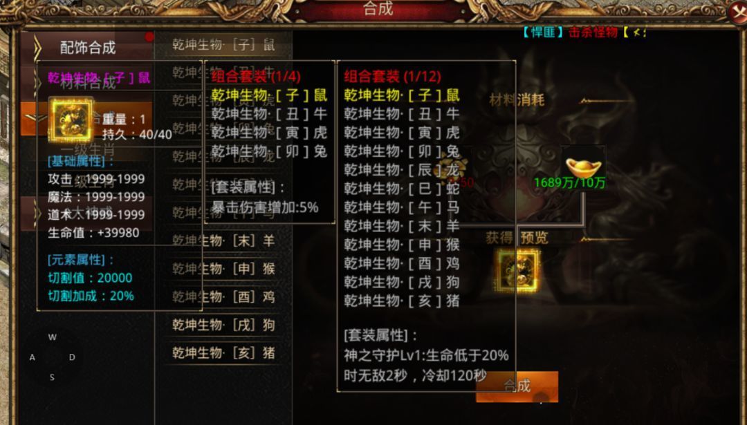 生肖共12件,可提升高额基础属性与切割值,集齐套装更有强力效果:生命值低于20%触发2秒无敌,极大增强PK战力。