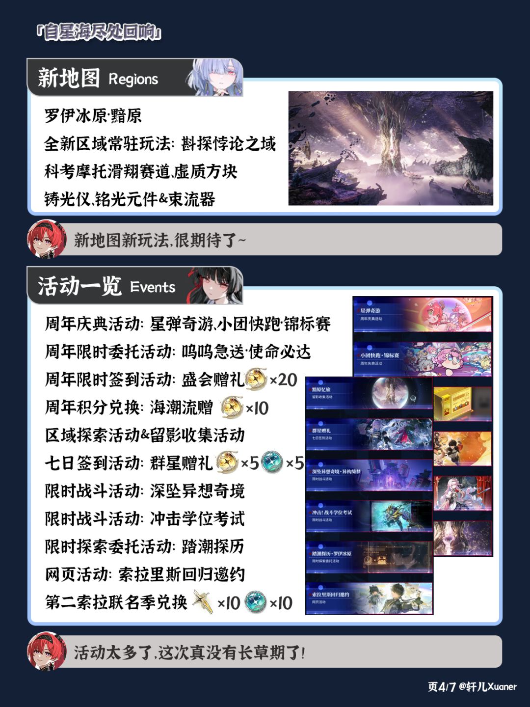 ③ 这个版本有非常多的活动和新地图,星声和抽数应该不错,开服前轩儿会给各位整理星声统计