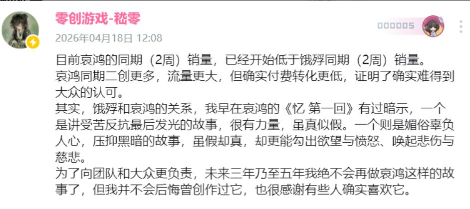 《哀鸿:城破十日记》制作人嵇零近日发文,坦诚本作次周同期销量低于同类型作品《饿殍:明末千里行》,直言游戏未能获得大众玩家的广泛认可。