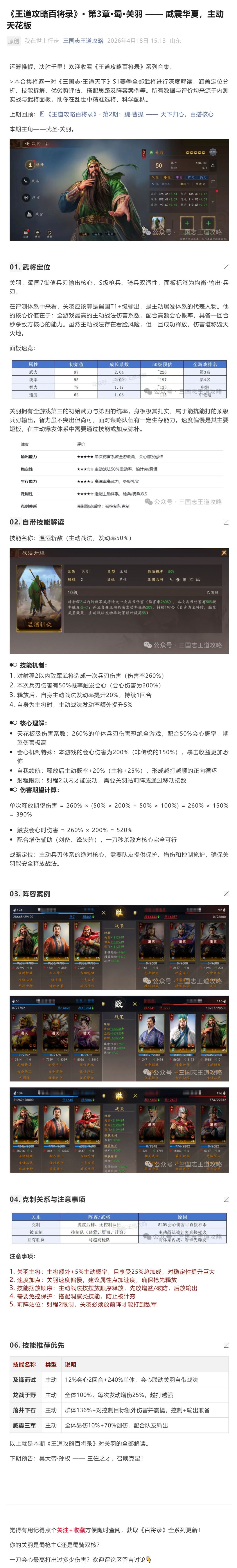 《王道攻略百将录》蜀·关羽 —— 威震华夏,主动天花板
