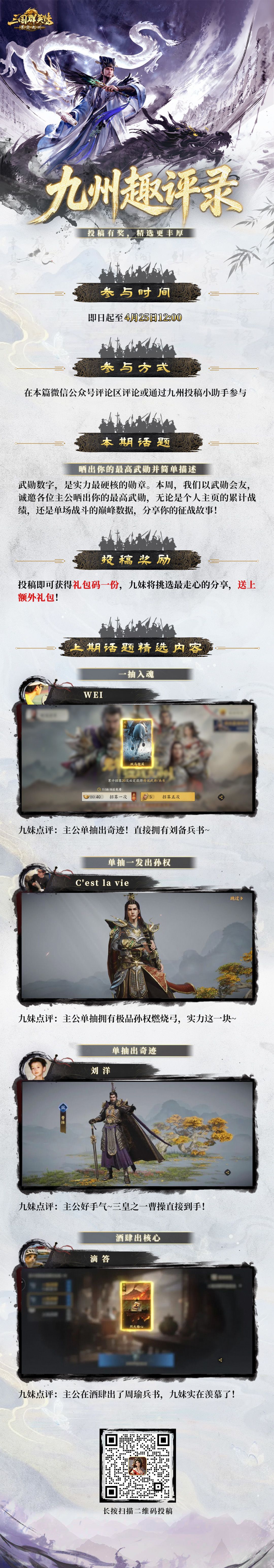 又到了每周最欢乐的【每周趣评】时间!上一期九妹邀请主公们【晒出你的一抽入魂】,不少主公都在秀自己一抽出的极品武将,九妹看的实在羡慕!各位主公手气太好了吧~
