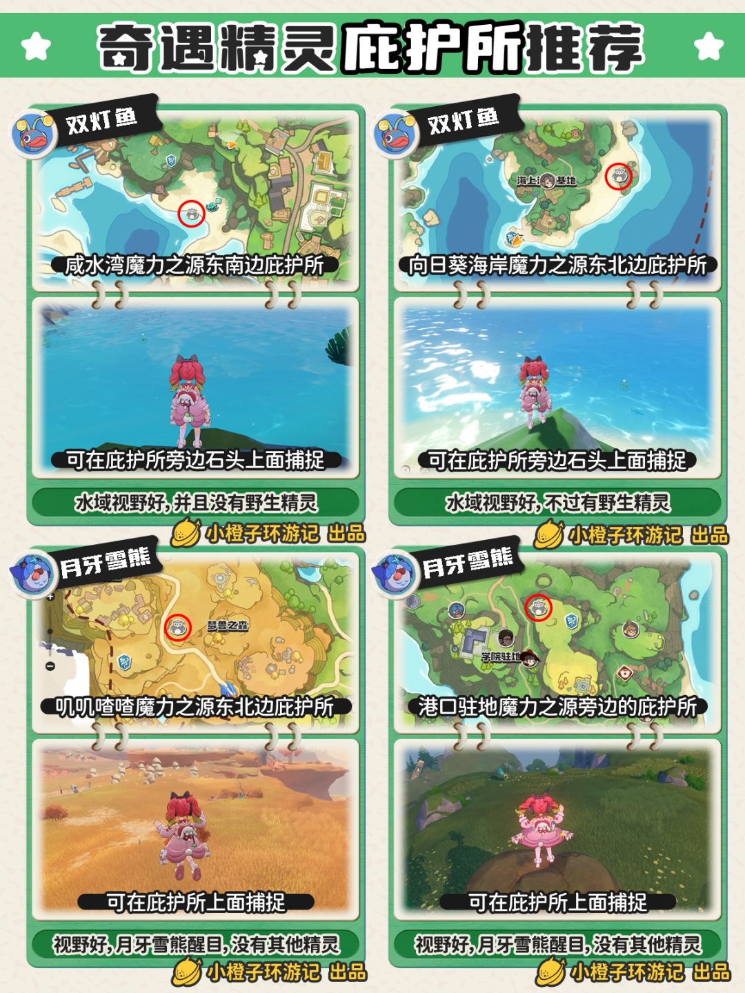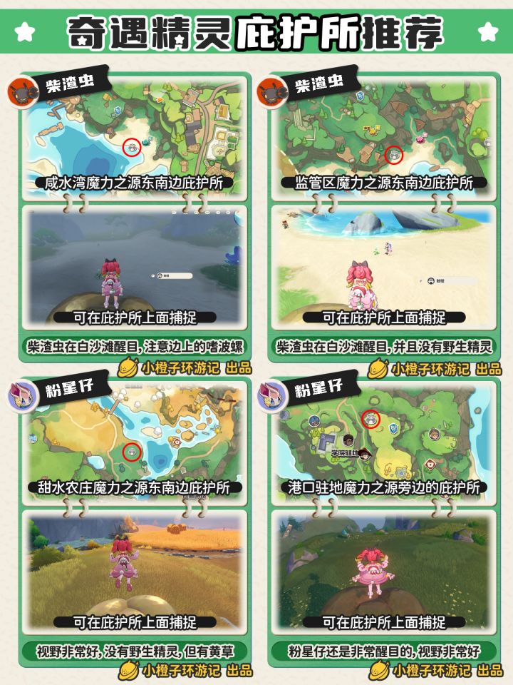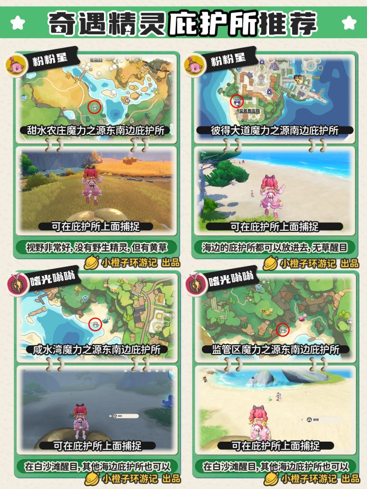 这一期是八大奇遇精灵庇护所推荐,橙子用最简单的话说就是大多精灵推荐海边的庇护所都非常不错,白沙滩,没草丛,没野生精灵,视野好非常适合捕捉;