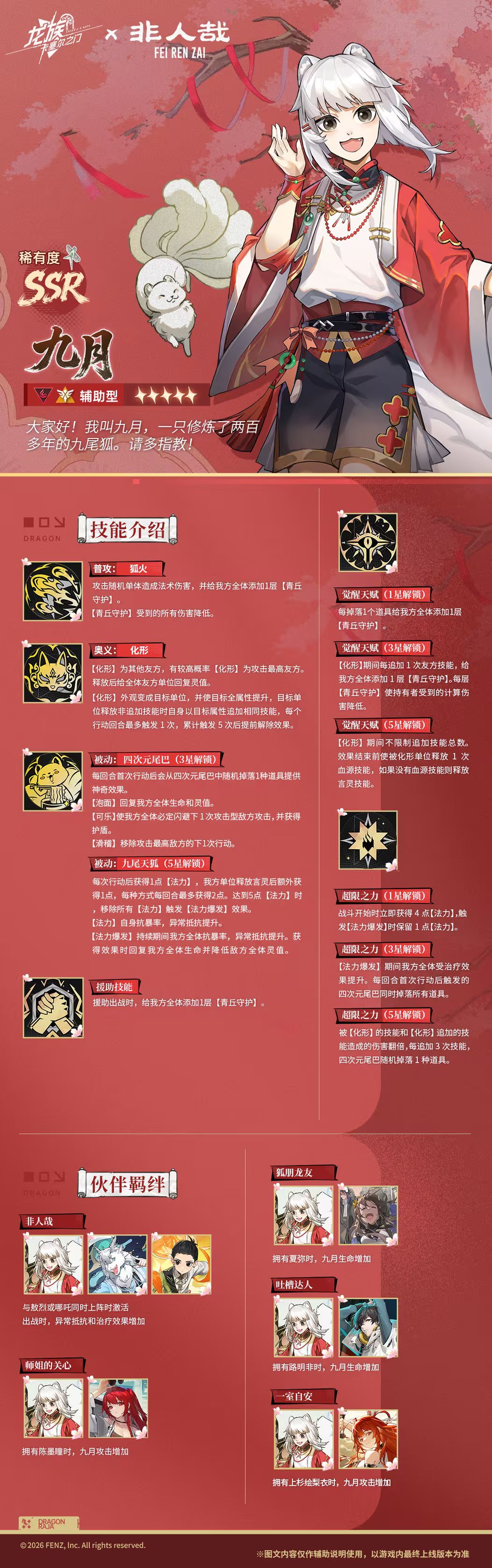 九月普攻狐火可造成单体法术伤害,并为全队叠加青丘守护减伤;奥义化形可模仿攻击最高队友,提升其全属性,还能追加技能、回复全队灵值,五星觉醒后更可无限追加并强制触发目标必杀。