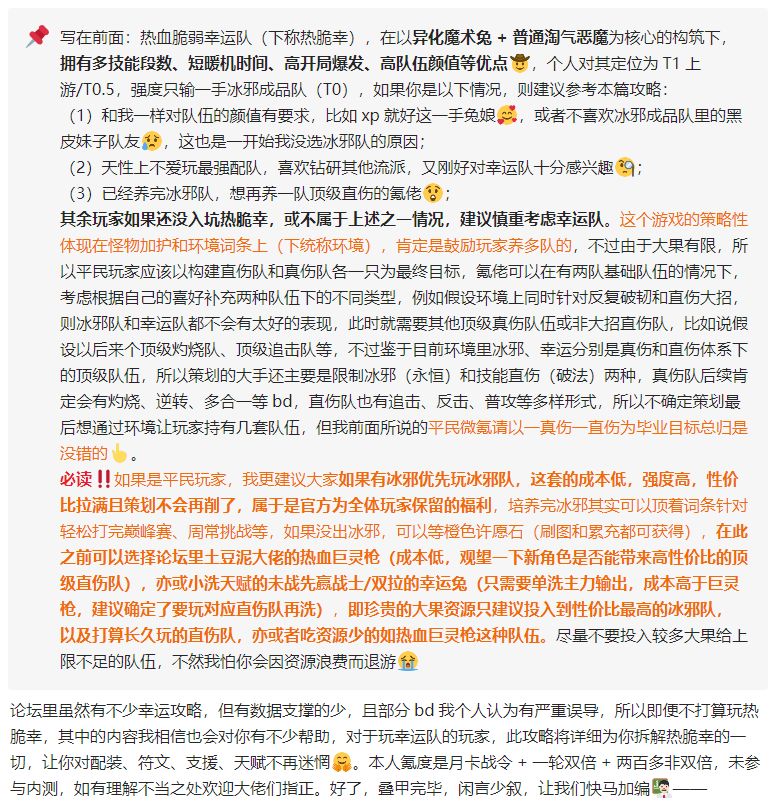 更新必看】(1)和兰斯大佬(论坛里最先发鼓舞幸运队的那位大佬)交流了下,这里感谢大佬的指正,我们两个构筑幸运队的思路是没错的,幸运兔是多段法师,从这个游戏的设计语言来说是适合吃脆弱和热血增伤的,小恶魔最好叠脆弱层数,异化贝能提供数量不俗的热血,但实践中,遗言框架的诱导增伤才是增伤的归宿,热血脆弱幸运的单段伤害还是太低了,容易出现破不了防的情况,而且增伤数值实在有限,破防了伤害也比不了诱导增伤,建议大家先玩冰邪队,条件允许去一群抄一下内测大佬们的其他配队(我在3群,好多顶级搭配学不到