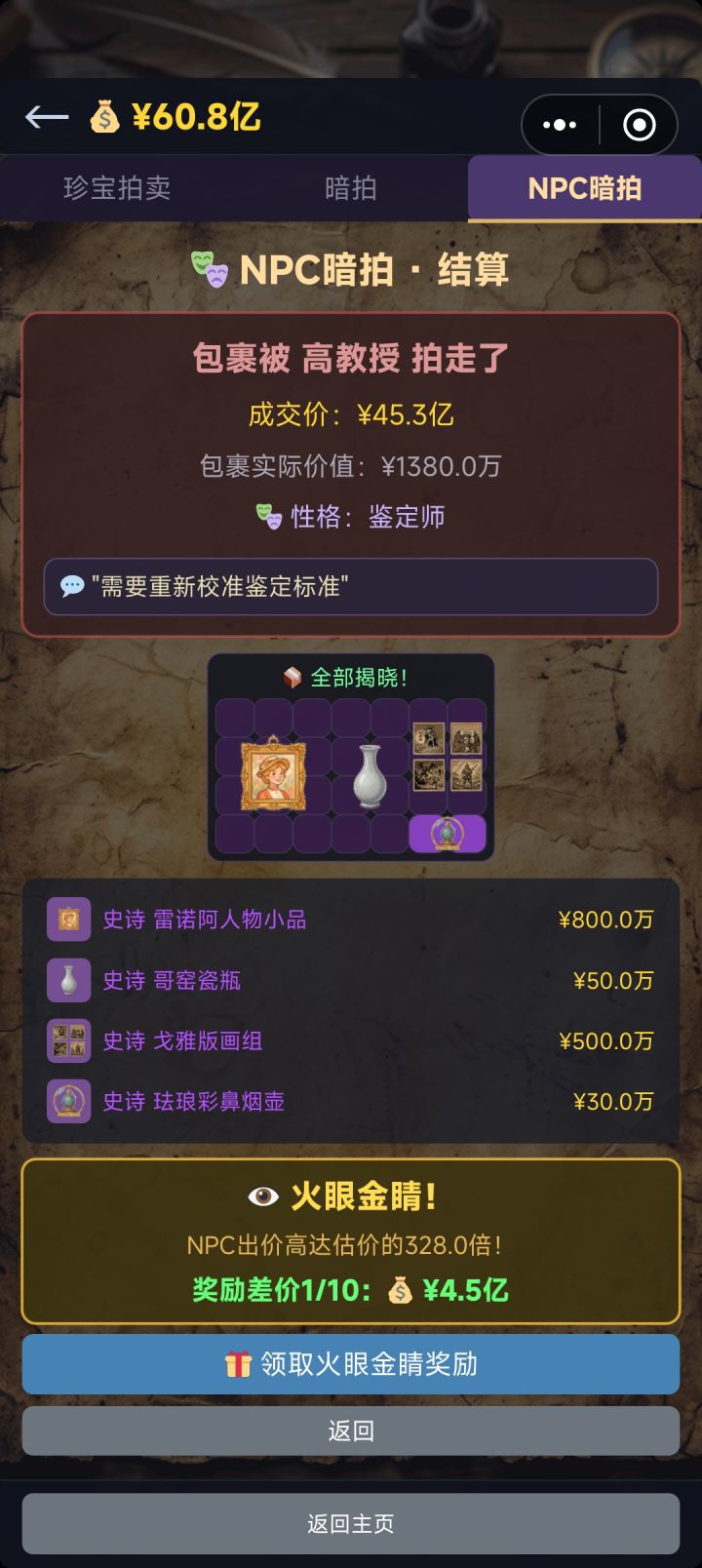 有一说一前两场真的能捞到好东西吗,拍了四十多把只有两次小亏买下,其他时候大都是NPC五倍溢价之内买下,尤其是初级场。我是估的挺准,但是拥有冤大头抢先怎么办