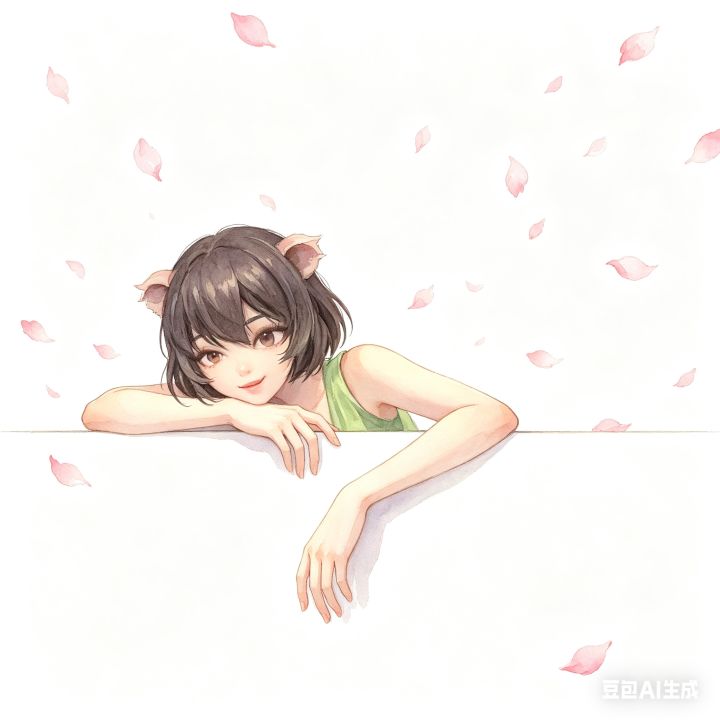 1:1正方形构图,图中人物探出上半身,其余被遮挡,一只手臂撑在细细的横线上,另一只手臂自然垂落,两只手一高一低,人物靠左不要太大,慵懒的姿态,横线位置在画面下半部分三分之一处(横线以下留白干净),突出人物。背景为纯白色,点缀些许飘落的粉色花瓣,线条干净流畅,平涂+柔和渐变上色,清新治愈的水彩质感,高细节,高完成度。