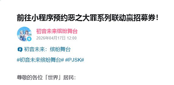 据了解,官方于4月17日发布动态,引导玩家通过相关小程序预约「恶之大罪」系列联动活动以获取招募券等福利内容。