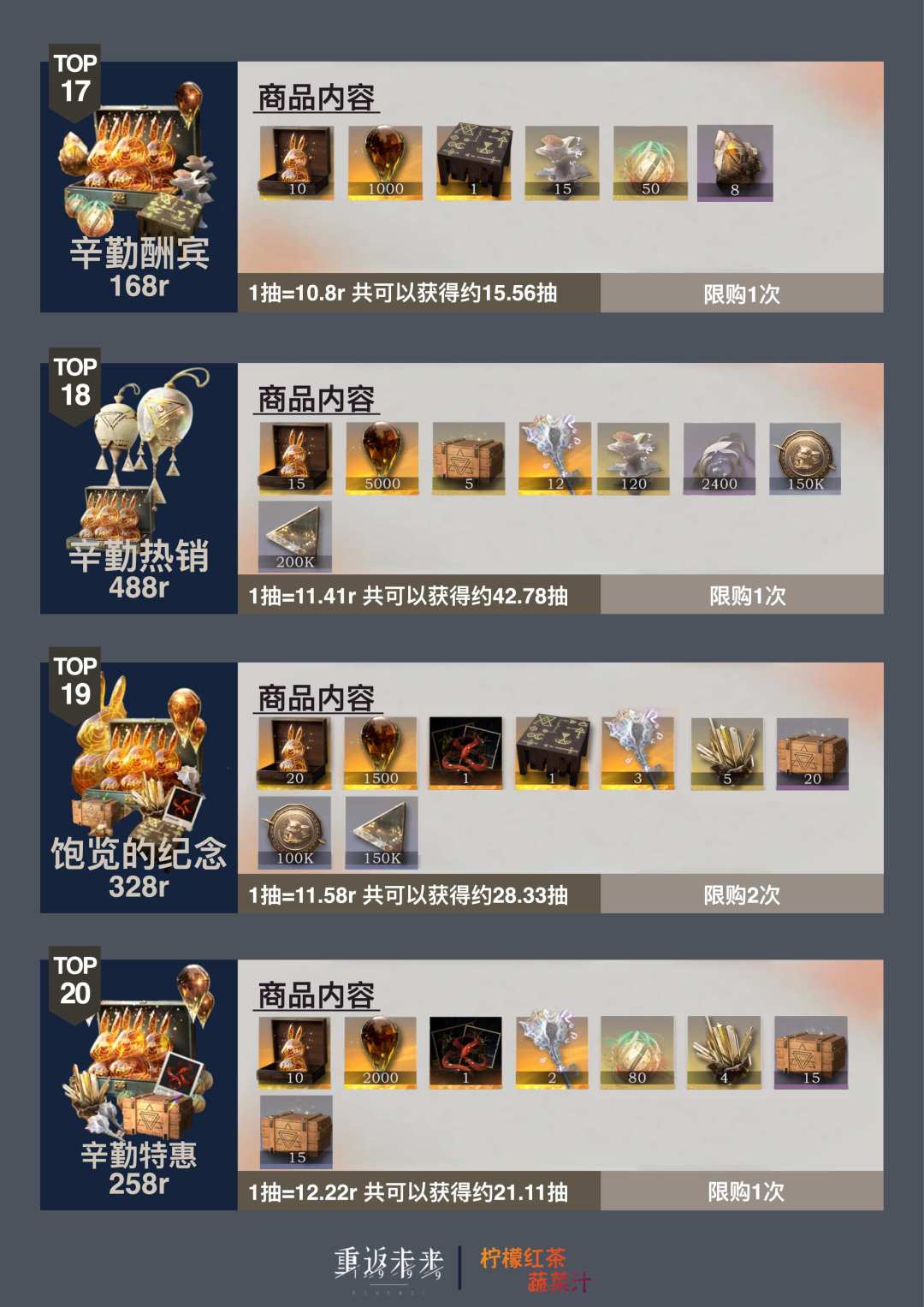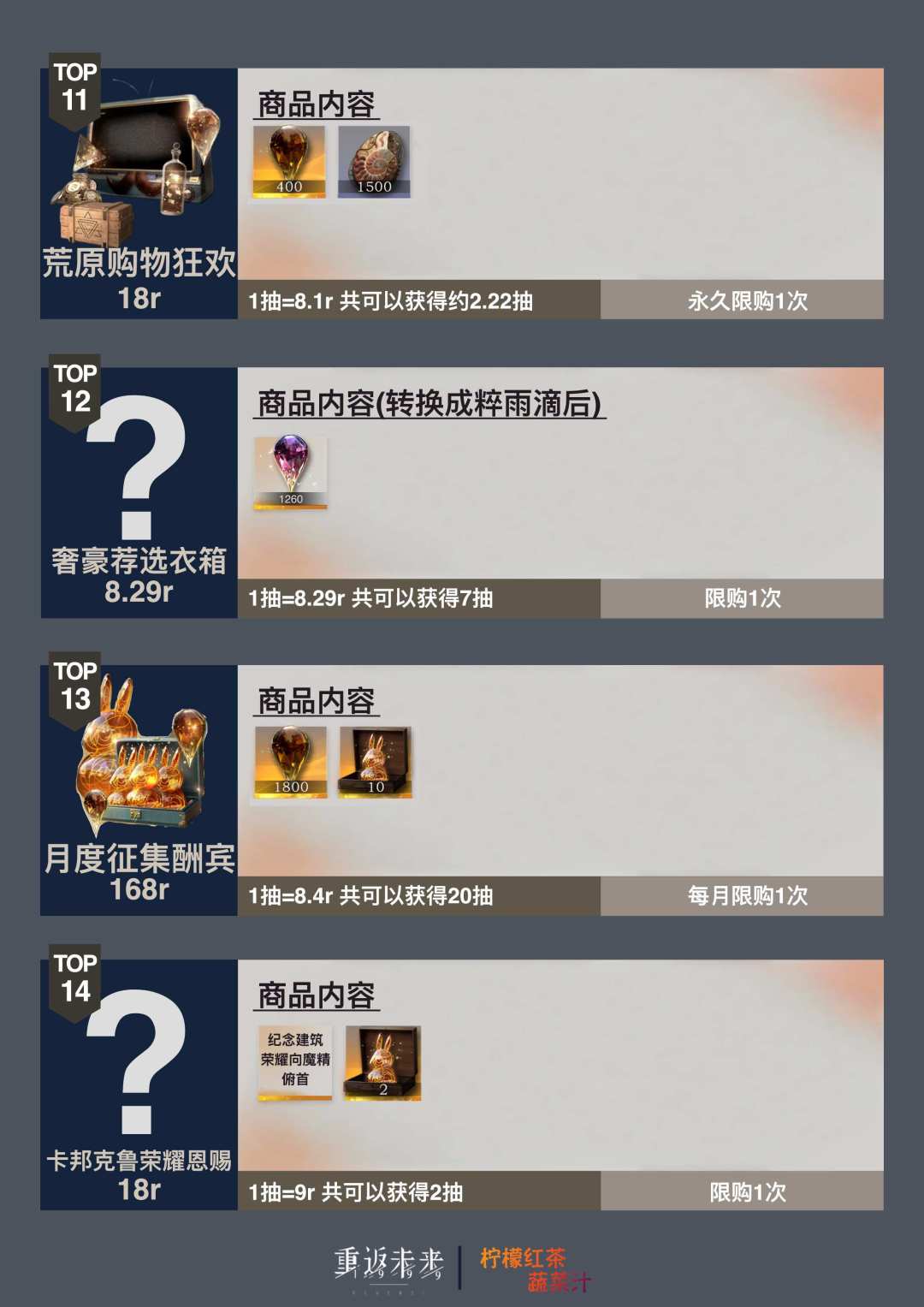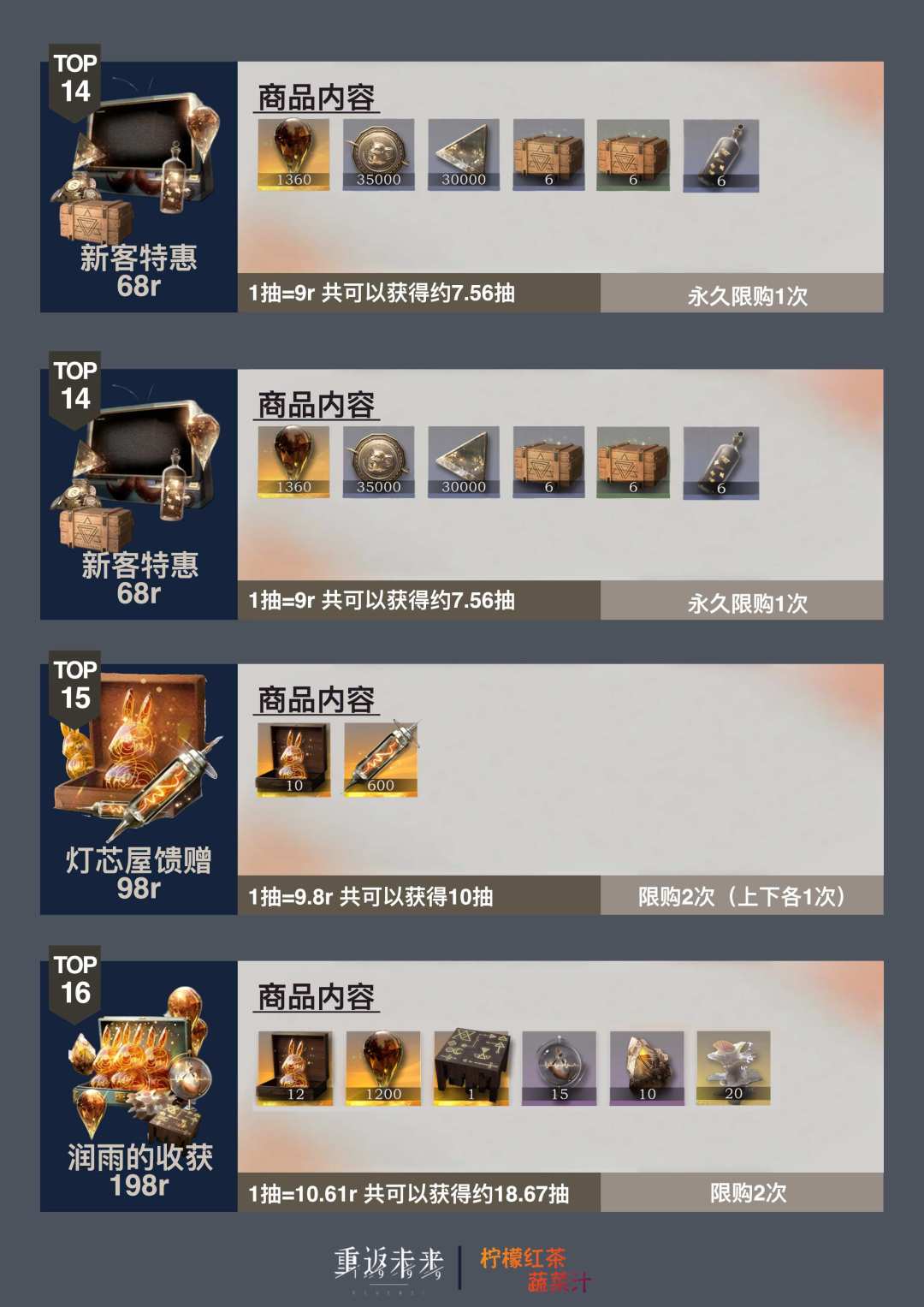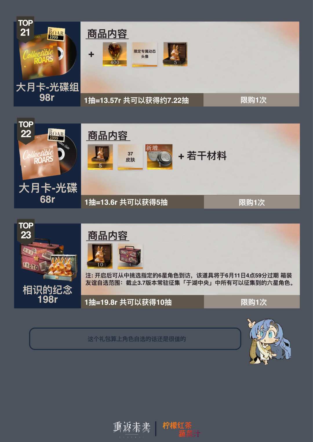 这个笔记展示了3.7主线版本「雨滴」&「金兔子」礼包性价比排行榜