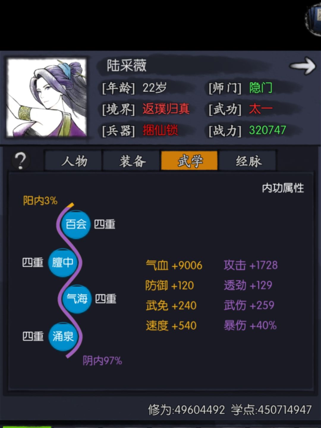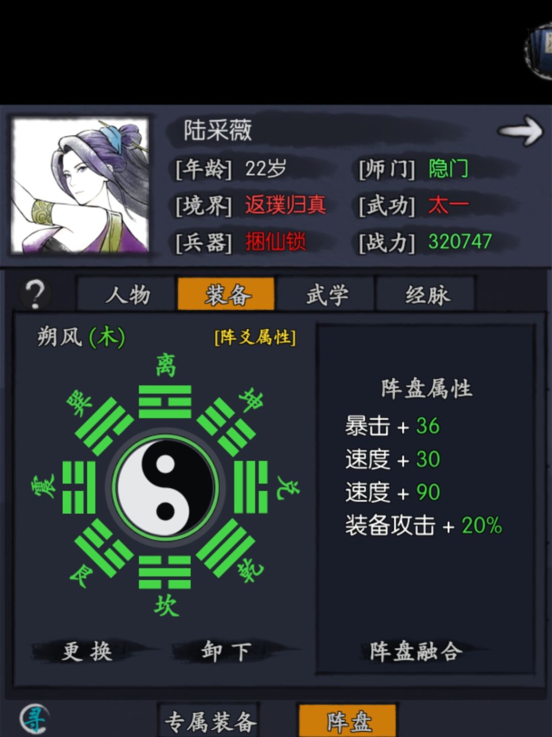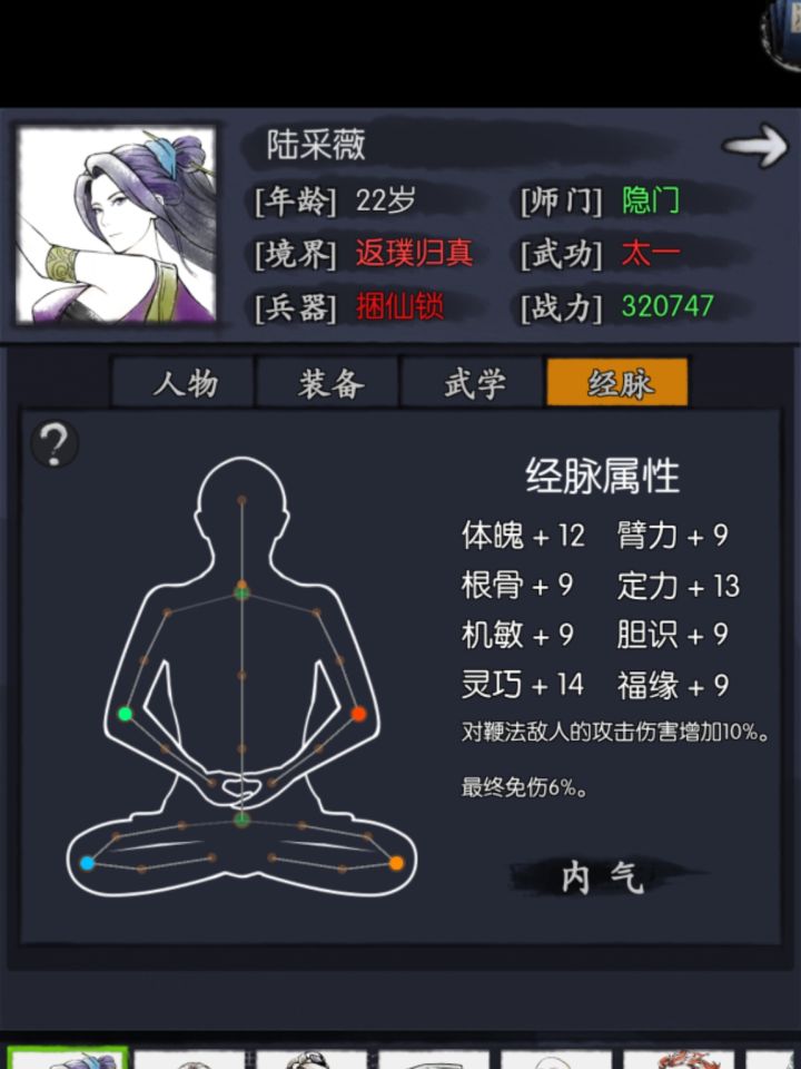 2.培养核心思想就是先凑速度,再累积攻击类属性,所以配装里面用了震天戒指,武器用了捆仙。但是鞭子侠客就是快不过用剑的和用拳头的,所以克制陆的也确实很多。速度比他快克制他,一鞭子抽不死的克制他,所以生存条件较差。走阴丹,洗练和清遂都走输出思路,这个没啥好解释的。阵盘也是考虑速度。内气也是速度速度速度,因为陆不先出手一般就是输了。