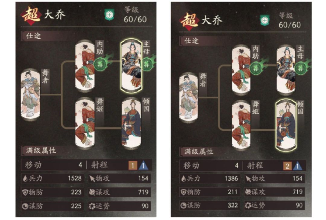 大乔作为纯治疗战意辅助时,推荐首选主母路线,走单线精通十二,倾国线交龙骧之印*1拿「绝代风华」即可。主母线兵种被动有额外单体战意回复,可作为额外治疗使用。