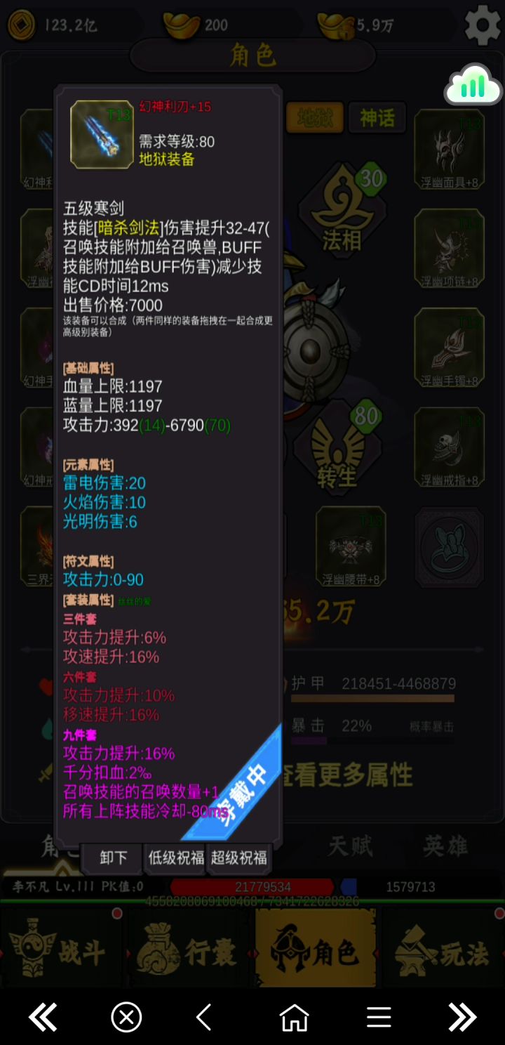 然后攻击6万以上考虑噩梦暗殿(6万雷鸣10能打完但是有点慢)这阶段就是搞套装了,套装优先10 13/14太远,多一个白虎会让你效率大增,然后地狱图重复上面操作,地狱图优先把攻速拉倒150以下,这个就需要你疾风等级高了,不然不好凑。当然也可以搞地狱8套过度,攻速提升16% 基本就这样
