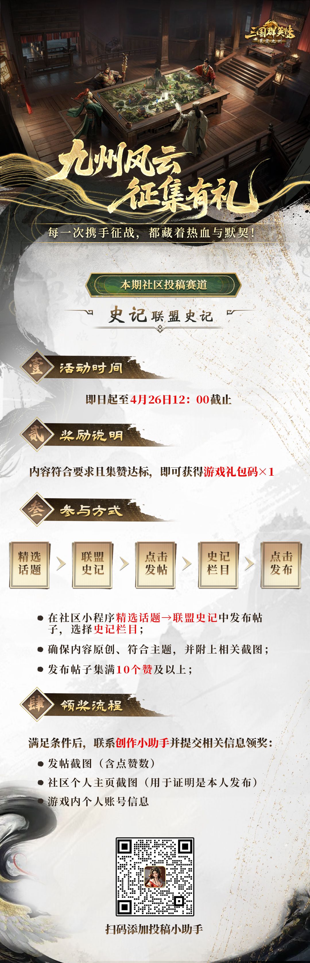 每一场联盟合围、每一回盟内集结、每一次兄弟驰援,都留下了各位主公的身影,也都值得被记录!九州玩家同盟故事征集活动,诚邀各位主公积极投稿,分享属于你的同盟荣光!