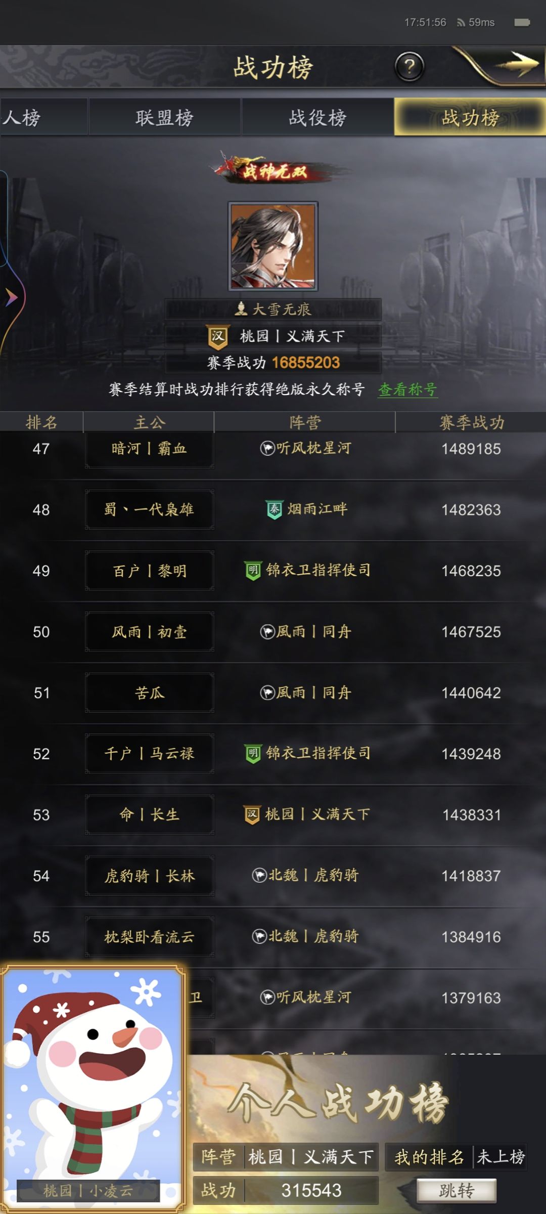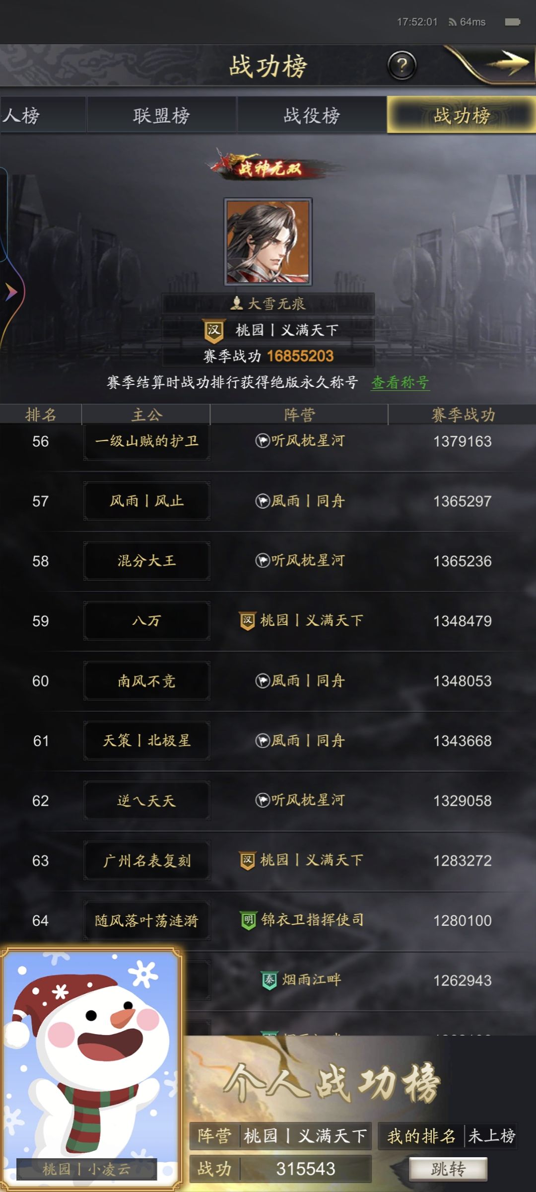 最后这10天,刷战功确实快,又是打器械,又是互刷主力的,战功飙升非常快,从前10,一路狂飙到前3了。这称号确实吸引人,不过很难拿。下面嗮下各盟高战的战功