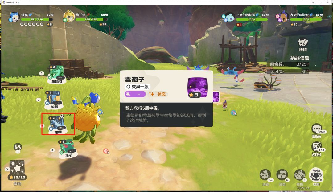 开始挑战时,迪莫站左边,用克制技能清右边的怪,格兰球根吸收就行(注意开始不要两只精灵都被挂毒,格兰球中毒无所谓)保持格兰球不要死,一直根吸收