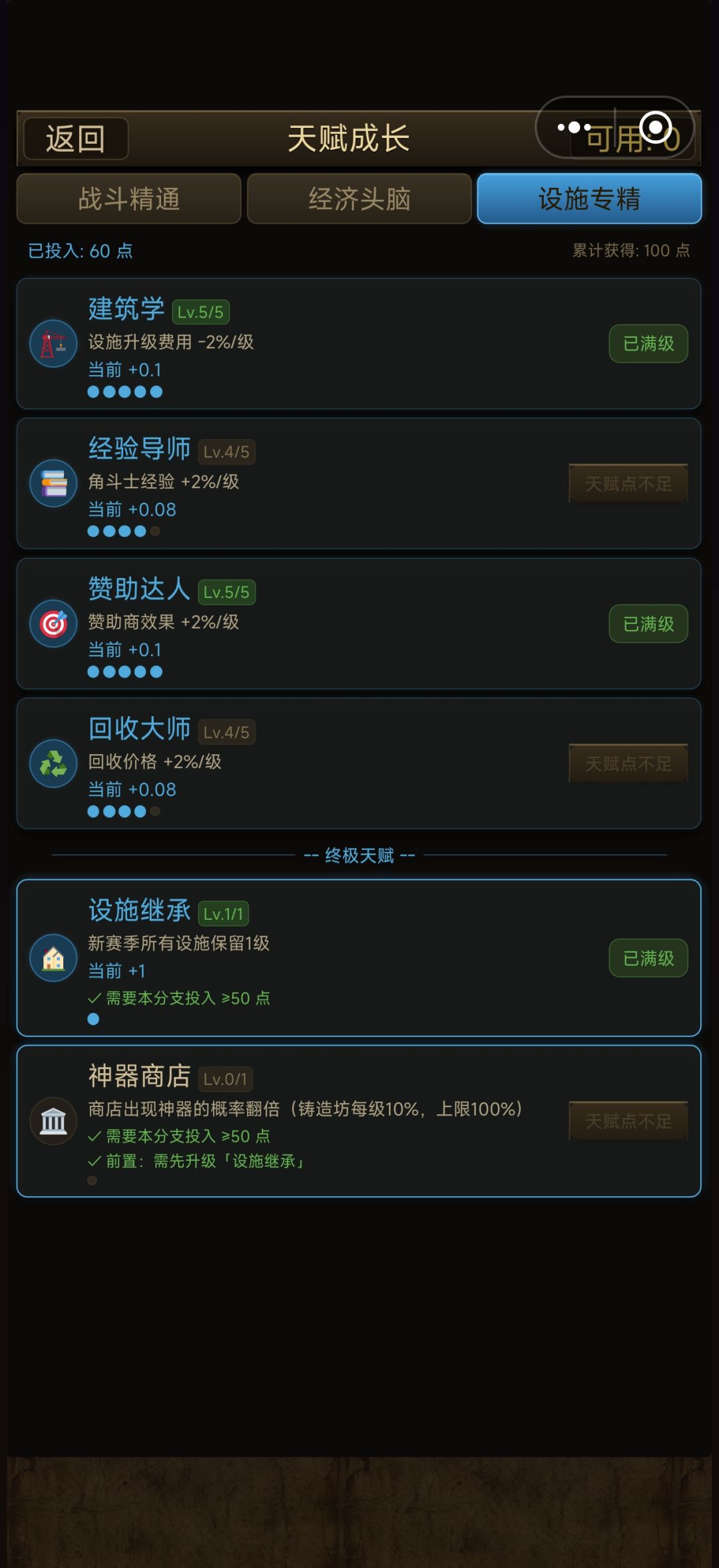 想要学习到这个天赋最少需要60点,也就是送的天赋如果不乱用是可以激活的,这里我推荐满级建筑学,满级赞助达人,满级经验导师,然后回收大师3级就可以解锁最终天赋了,满级15点,三个满级45点,三级6点,也就是51点,激活终极天赋需要10点,一共花费51点,剩下的可以去点经济头脑天赋。