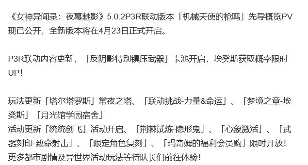《女神异闻录:夜幕魅影》 近日传来喜讯,官方公布了与P3R联动版本,全新版本将于4月23日正式开启
