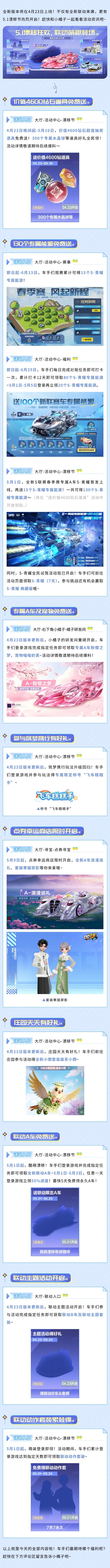 4月23日,全新版本上线!听说价值4600钻石道具、130个S-青耀专属能源、A车粉樱之梦……这些竟然都是送的!当然不止这些!想了解更多福利内容车手们速戳下方图片查看哦~