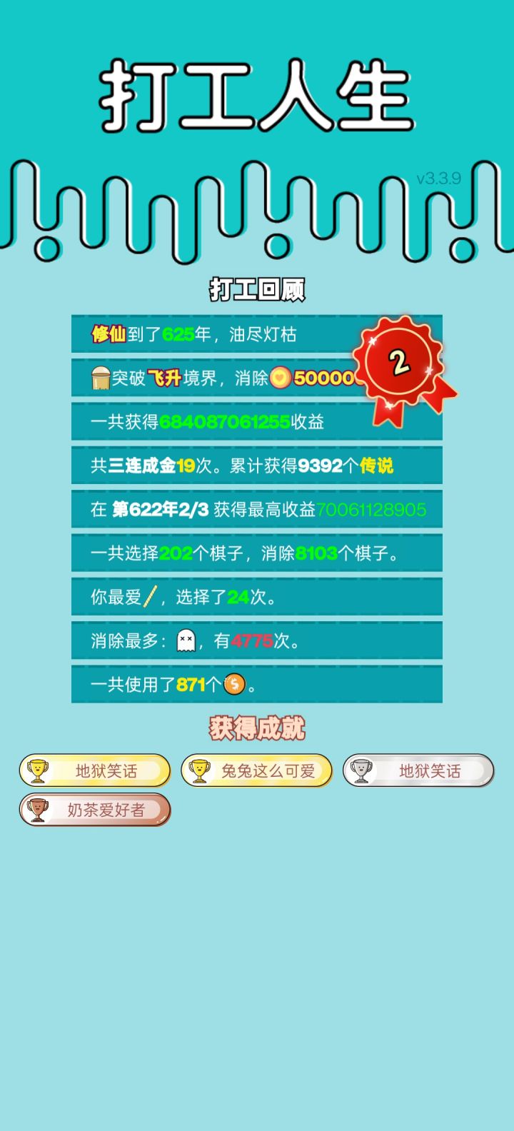 我打工坚持了625年。获得了第2名。共获得684087061255收益。累计获得9392个传说棋子。共选择202个棋子,消除8103个棋子。我最爱吸管,选择了24次。获得了4个成就!