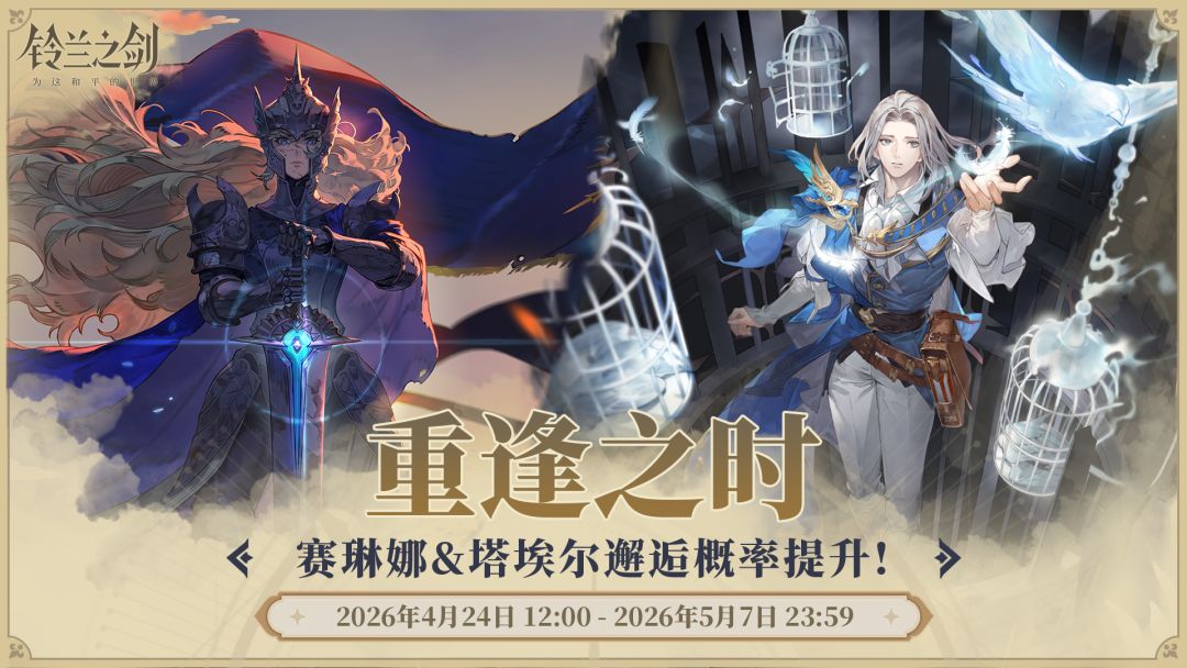 「重逢之时」限时邂逅将于 2026/04/24 12:00 - 2026/05/07 23:59 开启,传说角色「赛琳娜」、「塔埃尔」邂逅获取概率将大幅提升!