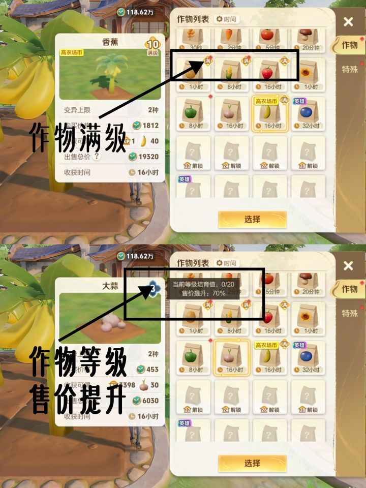 3.点击作物右上角数字可看到具体的等级和售价提升