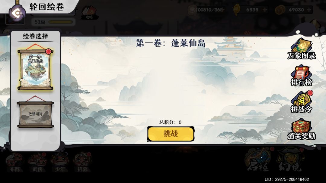1、首轮开启第一卷【蓬莱仙岛】,总计11个难度,完成第一难度挑战后进入命劫挑战,命劫有10阶难度,完成挑战可获得通关奖励(封印卷轴、万宝琉璃、天工兵魄等);