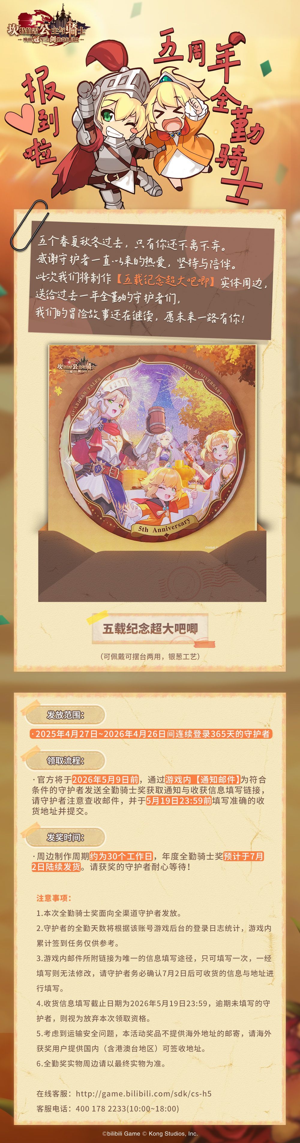 今年我们将制作【五载纪念超大吧唧】实体周边,送给过去一年全勤的守护者们!感谢过去日日夜夜有你们的陪伴,未来坎公依旧一直会陪着各位守护者们!