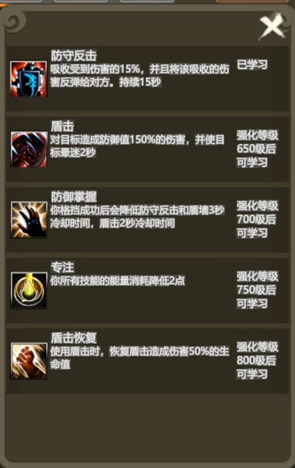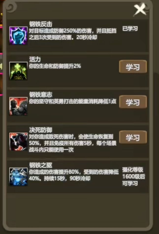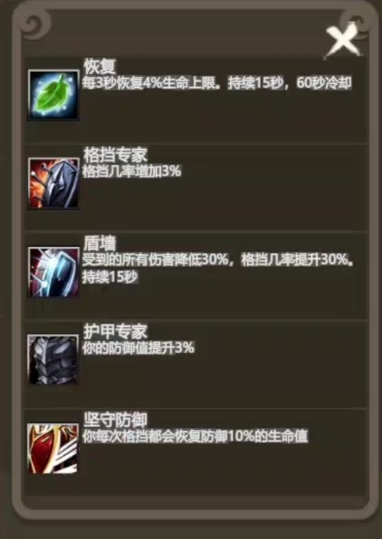 防战被动还是很强力的,有防御,有奶力,有输出。要是多两个防御百分比输出技能的话(主动输出技能太少),那他输出也是T0级别了。后面再配合学习的公用技能和主城学习的其他职业技能。