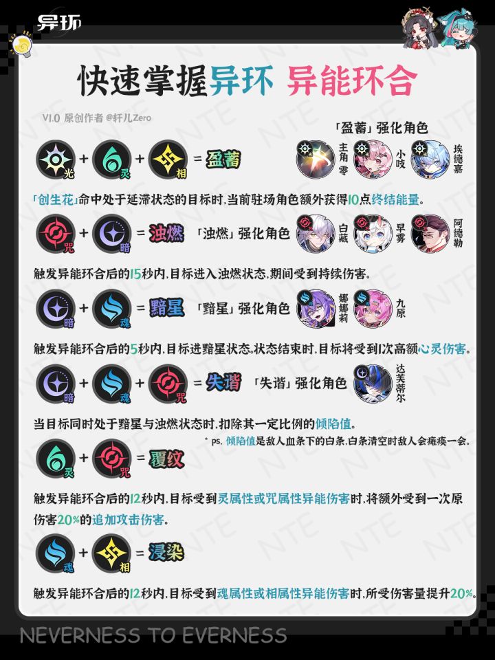 ⭐ 第二页为异能环合触发方式,攒满环合值切能环合的角色即可触发,第三页为异能环合类型效果,除覆纹和浸染外,其余6种异能环合可根据角色的援护技被动进行强化。因此异环配队一般就可以根据环合类型来进行搭配,后续轩儿Zero会为各位鉴定师们带来异环公测1.0版本的推荐配队~