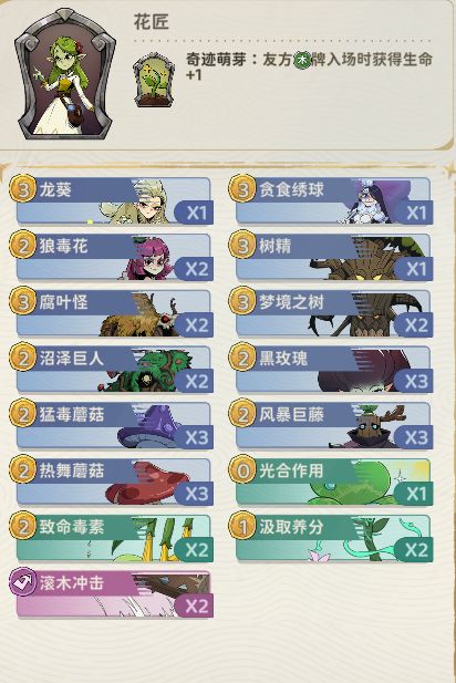 初始御三家的花匠 卡组里有个猛毒蘑菇 挂毒特别好用 再配合咒术挂毒 而且还能和龙葵 绣球打联动 越打越强 很克制低费流派啊
