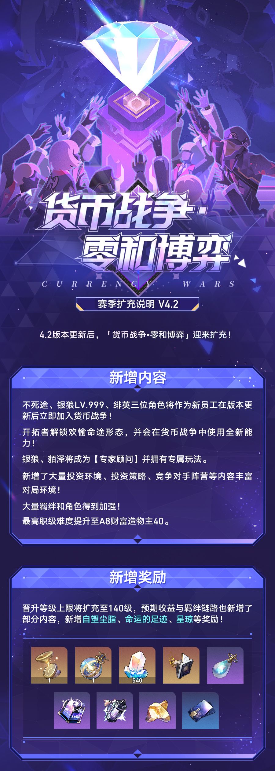 此次V4.2版本「货币战争•零和博弈」赛季扩充,为这一核心常驻玩法注入全新活力,新角色、新等级、新机制的多重更新,既满足老玩家的深度养成需求,也为新玩家带来更丰富的玩法体验。随着4.2版本临近,开拓者可提前规划养成方向,备战全新赛季,体验升级后的博弈乐趣。